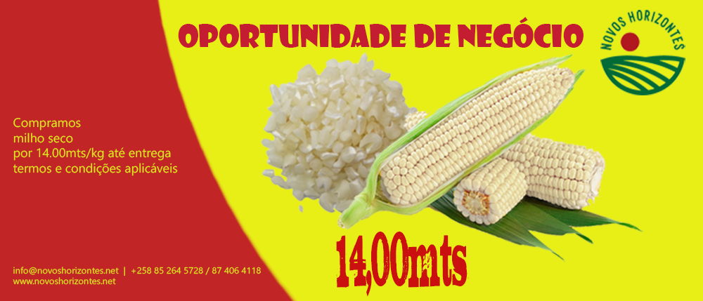 A Novos Horizontes vem por este meio comunicar a todos agricultores, que estamos interessados em adquirir milho seco em grandes quantidades a 14.00mts/kg, se é agricultor e tem estoque do produto mencionado não hesite em contactar.